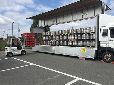 会社構内で飲料製品をフォークリフトで積み込みしています